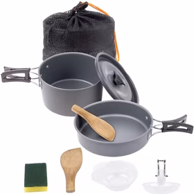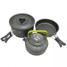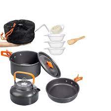 • اجزاي ست: قابلمه، ماهيتابه، كتري، 3 عدد كاسه كوچك، ملاقه با دسته تاشو، قاشق چوبی، اسفنج